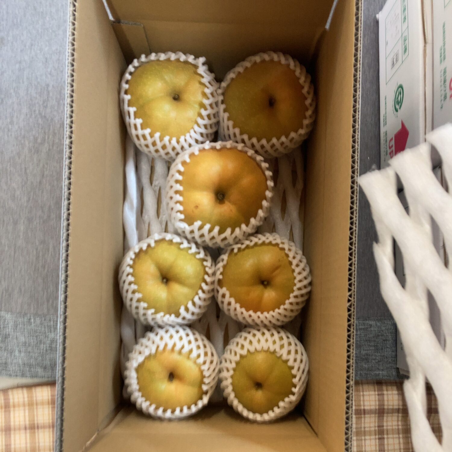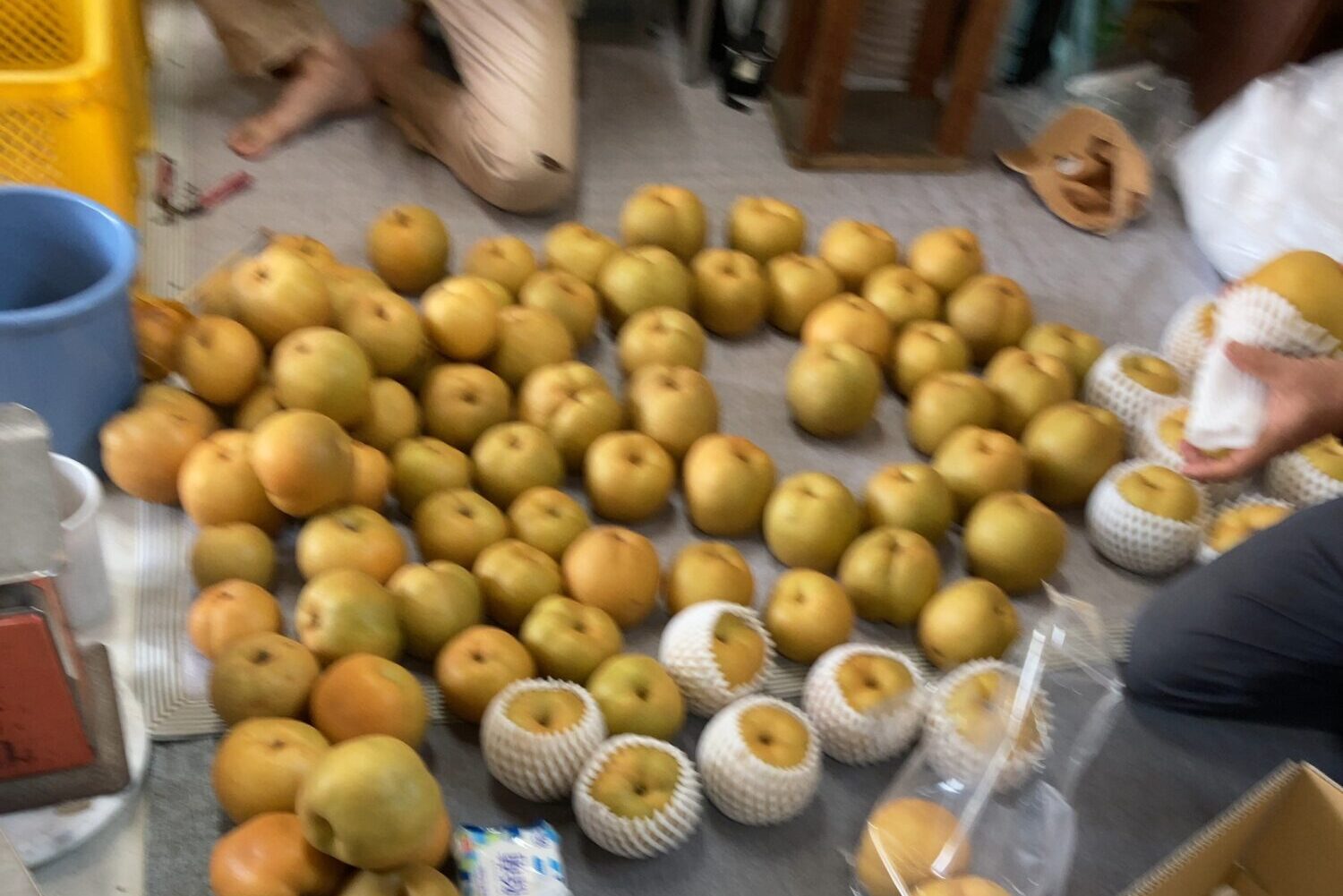 朝に収穫した梨はお店で傷や形をチェックし仕分けを行います。